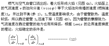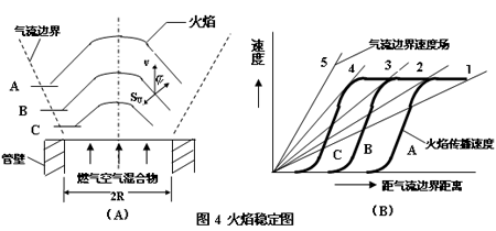 ??? 由圖4可見,當氣流速度為線2時,火焰穩(wěn)定在A平面。當氣流速度逐漸增加時,火焰可以穩(wěn)定在B或C平面上。如果氣流速度增加至5時,由于射流作用,沿氣流邊界會混入過多的空氣,使Su下降,火焰得不到平衡的位置,火焰脫離管口,發(fā)生脫火現象。相反當氣流速度下降,達到線1時,火焰可以進入管內,發(fā)生回火現象。