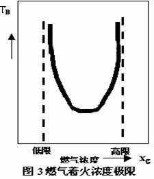 ??? 由圖3可見:當燃氣在混合物中的濃度過高(高于高限),TB值為無限大,無法達到TB,表示混合物不能著火,相反當燃氣濃度過低時,也不能著火。當燃氣濃度低時,表示燃氣燃燒產生的熱量無法把混合物加熱到著火溫度TB,所以也不能著火。當燃氣濃度過大時,表示空氣不足,只有很少的燃氣可以得到空氣燃燒產生熱量。這時得不到空氣的燃氣不但不能燃燒產生熱量并且還會和惰性氣體那樣吸收熱量,使產生的熱量永遠小于散熱,于是也不能著火。這就是燃氣過多也不能燃燒的原因。