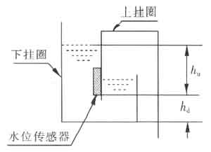 儲氣罐水封報警可以采取開關量報警和連續監測報警。開關量報警就是在警戒水面設置機械開關,水封高度低于該水面后,開關觸發,啟動水封報警裝置,該方法比較簡單,但是由于無法知道當前的確切水封高度,只能起到報警作用,達不到對水封的監測作用,不能適應在不同儲氣罐內壓下測量水封高度的要求。采用液位變送器連續監測儲氣罐的水封高度,可以很直觀地掌握各個塔節的水封高度,并通過計算機處理數據,給出最佳的補水時間。其基本方法是在各個塔節的上掛圈設置量程為1m的水位傳感器(見圖1)。