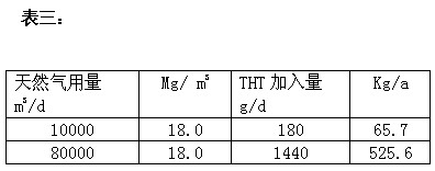 參考國內外及考慮加臭設施的資料,加上我市的天然氣含有微量硫化氫,本文認為,我市的天然氣加臭加入量定為18mg/m3 是合適的,并以此計算及選擇設備。因為此時天然氣在空氣中的濃度約為0.95-1.0%,其相應的可察覺濃度約為 0.18mg/m3 。在實際運行過程中,應根據季節及氣溫情況不斷進行調整。按THT加入量為18mg/m3計算的致臭劑耗量見表三。