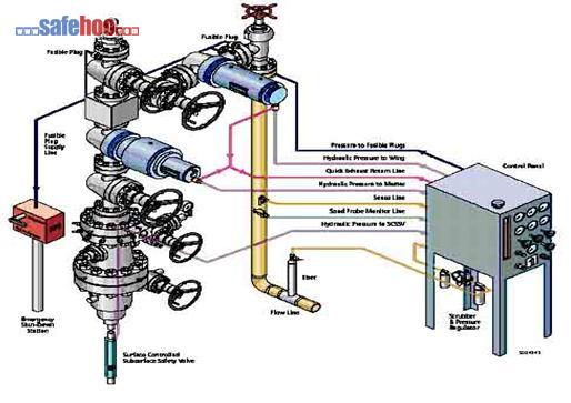 ??????? (3)在以下情況下采用自動緊急關斷:①檢測點壓力因故超高限(檢測到安全壓力高);②地面管線爆管泄漏事故(檢測到安全壓力低);③井口發生火災(易熔塞超過120゜C熔化);④有毒氣體的泄漏及其他要求。