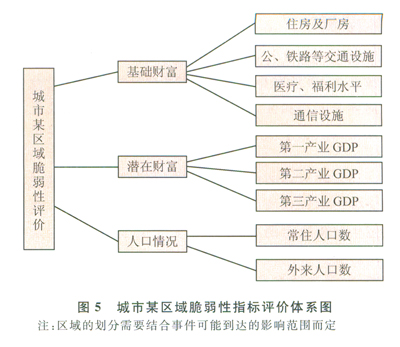 2)承災(zāi)對象的脆弱性對于事件的擴(kuò)散有著重要的影響,反映的是該區(qū)域的承災(zāi)對象對于災(zāi)害損失的敏感程度。對對象的脆弱性進(jìn)行評價(jià),找出影響對象脆弱性的重要環(huán)節(jié),并進(jìn)行有效管理,可以降低承災(zāi)對象的脆弱性,增強(qiáng)其承受突發(fā)事件的免疫力。結(jié)合層次分析等方法可以對對象的脆弱性進(jìn)行定量分析,以城市油罐爆炸為例,首先建立對象脆弱性的指標(biāo)評價(jià)體系,城市油罐爆炸事件,受災(zāi)對象是該城市爆炸點(diǎn)周邊區(qū)域的建筑設(shè)施及居民,具體的評價(jià)指標(biāo)體系有很多種,現(xiàn)列舉一種常見的評價(jià)體系[7](圖5)。
