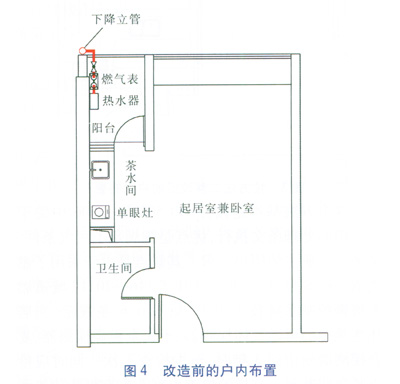 舉例:有一公寓戶型,茶水間作為廚房用,布置有煙道、單眼灶和洗手盆,并與起居室兼臥室相連。由于此戶型衛生間是暗室,因此,熱水器只能安裝在陽臺上,燃氣立管安裝在陽臺外側,燃氣表安裝在陽臺上,表前燃氣管道沿墻架空敷設,表后燃氣管道采用銅管直埋于墻壁,并引至熱水器。GB 50028—2006第10.4.2條規定,居民生活用氣設備嚴禁設置在臥室內。因此,此戶型的茶水間不具備用氣條件,原設計時我們也沒有將燃氣管道引入茶水間,而只供熱水器使用燃氣。改造前的戶內布置見圖4。