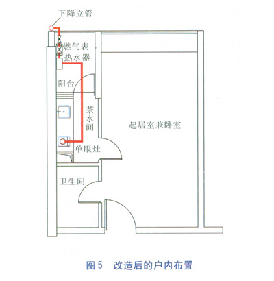 由于業主強烈要求不僅熱水器要供燃氣,茶水間內的單眼灶也需要用燃氣。因此,我們考慮了規范的要求,茶水間作為廚房用時,在茶水間與起居室兼臥室間增設實體墻和門,使茶水間與起居室得到有效隔離,并要求業主選用帶有自動熄火保護裝置的燃氣灶,這樣就滿足用氣條件。燃氣表后燃氣管道可以采用銅管直埋于墻壁,并分兩路,一路在墻壁敷設引進熱水器,另一路沿墻壁下來直接進入地板內敷設,從而連接單眼灶。這樣熱水器和單眼灶都能使用燃氣。改造后的戶內布置見圖5。