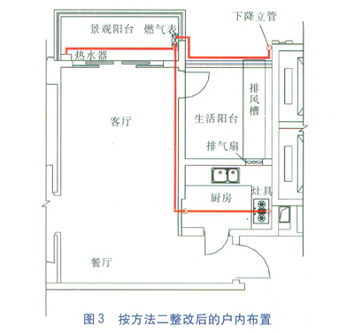 兩種方法都有業主選擇。雖然這個戶型的問題我們解決了,但是深究其中,就會發現越來越多的樓盤由于各種原因,陽臺的功能容易多變,在后期燃氣設計時要考慮各種可能造成無法通氣的情況出現。因此,建議把燃氣設計納入到建筑設計范疇,在前期設計時充分考慮,避免后期整改。