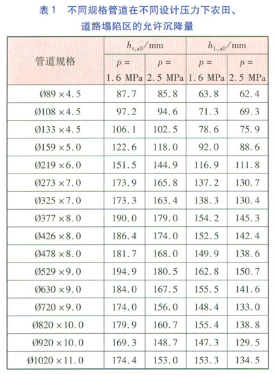 由式(9)~(12)可計算得到,不同規格管道在設計壓力分別為1.6、2.5MPa下,農田、道路塌陷區的允許沉降量(見表l)。