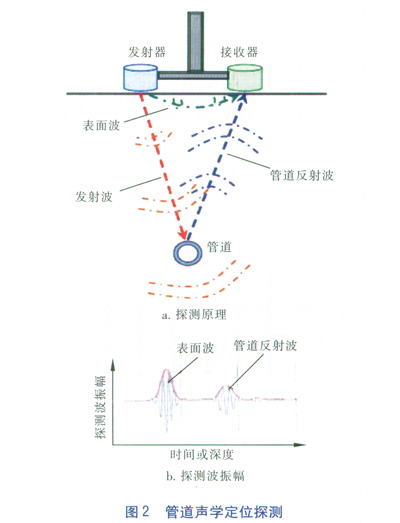 管道聲學定位探測時,發射器發射一束短聲波脈沖到地面(見圖2a),從任何不連續或帶有不匹配聲波阻抗的界面反射回聲波,其中管道光滑內表面和氣體的接觸面反射系數為100%,土壤或巖石與管道外表面的接觸面的反射系數均較低,接收器接收到地表表面波和管道反射波,其探測波振幅見圖2b。一般情況下,增大聲波頻率能提高其辨識小管道和附近管道的能力,但是隨著頻率的增加,土壤的衰減能力也增大。對不同埋深的管道,基于土壤衰減特性應設置最大使用頻率,根據土壤類型、濕度和夯實情況的不同,其衰減值的范圍為0.1~0.9dB/(kHz·cm),衰減系數取決于地面條件。
