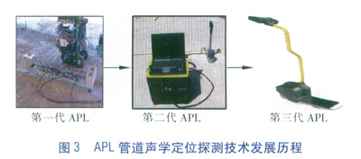 目前,市場上基于聲學定位系統開發的管道探測儀以APL聲學管道定位儀(簡稱APL)為代表。20世紀90年代后期,美國燃氣研究院(GTI)開始研究船管道聲學探測技術,后來將該技術授權給美國杰恩公司,并于2011年基于聲學探測技術的APL開始商業化,其發展歷程見圖3。該儀器由操作面板、發射機、接收機、手柄等組成,其工作流程如下:儀器操作時要平放在地面上,以便與地面形成較好的耦合,按動按鍵發射一束聲波脈沖,該束脈沖會持續約2s,這個過程稱為一個點探測。操作者繼續向左或向右平行移動15~30cm再做一個點探測,如此反復完成一個截面多個點探測(至少做5個點),最終顯示界面把該截面內所有點探測結果綜合為一個管道位置點顯示出來。
