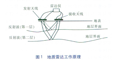 地質雷達是一種使用高頻電磁波探測地下介質分布的非破壞性地球物理探測方法,其工作原理是:發射天線向地下發射電磁波信號,在電磁波向地下傳播的過程中,當遇到電性差異的目標體(如空洞、裂隙等)時,電磁波便發生反射,由接收天線接收反射波。地質雷達工作原理見圖1[4-5]。