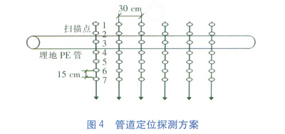 根據CJJ 61-2003《城市地下管線探測技術規程》、GB 50028--2006《城鎮燃氣設計規范》、CJJ 33-2005《城鎮燃氣輸配工程施工及驗收規范》和CJJ 63-2008《聚乙烯燃氣管道工程技術規程》的相關規定和工程資料制定探測方案,見圖4。