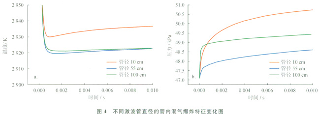 事故表明,可燃氣體泄漏空間尺寸存在較大的隨機性。鏈式反應理論認為,鏈反應中生成的活性基團在擴散過程中會因與壁面碰撞而消亡,活性基團銷毀速度取決于鏈的有效碰撞數,因此爆炸反應過程與空間形狀、尺寸有較大關聯。圖4給出了不同激波管內徑在初始溫度298K、0.6kPa初始壓力條件下,對爆炸溫度、壓力變化的影響。本文采用3種管徑進行計算比較,管徑之比約為1:5:10,在激波管長度相等的情況下激波管內表面積之比約為1:25:100。管內壁對爆炸鏈式反應過程的影響主要體現在兩個方面,包括對活性基團的銷毀速度和體系向環境散熱速度的影響。
