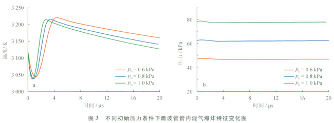 受限空間內可燃氣體泄漏后,環境壓力會存在一定的差異。圖3-a給出了不同初始壓力對激波管內混氣溫度變化過程的影響。隨著初始壓力提高混氣爆炸發生時刻逐漸提前,分別為1.4ms、1.0ms、0.8ms。原因在于一方面高壓條件下氣相反應速度較快、熱釋放速度提高,另一方面混氣熱傳導性能降低導致熱損失減小,從而使爆炸反應更加容易進行。在不同初始壓力條件下混氣引爆后的溫度峰值基本一致,但達到峰值所用時間存在差異。當初始壓力為1.0kPa時,達到溫度峰值所需時間約為2.8ms;而初始壓力為0.8kPa時,達到溫度峰值所需時間約為3.4ms;初始壓力為0.6kPa時,達到溫度峰值所需時間約為4.4ms。計算結果表明,提高初始壓力使反應速度加速、升壓速度提高,會更迅速達到峰值溫度。此后,在不同壓力條件下混氣溫度下降速度基本一致。