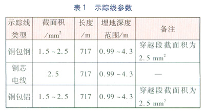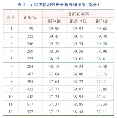 ①對檢測數(shù)據(jù)系統(tǒng)分析得知,銅包鋼、銅芯電線、銅包鋁三種示蹤線,在截面積相同的情況下,對探測電流信號傳導(dǎo)情況無明顯的差異,銅包鋼和銅包鋁這兩種示蹤線傳導(dǎo)信號情況幾乎一樣,銅芯電線示蹤線傳導(dǎo)信號稍好一點(diǎn),但無顯著差別。