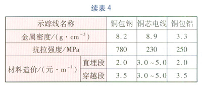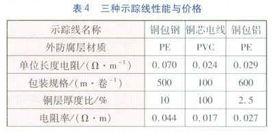 為了能更全面地評價(jià)出各示蹤線的優(yōu)缺點(diǎn)及性價(jià)比,將三種示蹤線的性能、價(jià)格等因素進(jìn)行比較[2],詳見表4。表4中,銅層厚度比是示蹤線中的銅層厚度與示蹤線的金屬部分的半徑之比。