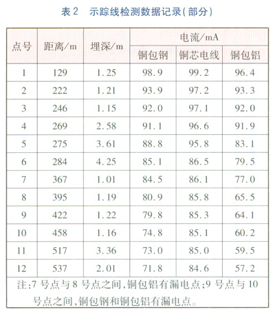 ②三種示蹤線在接頭部位防腐處理方面差別較大。在測試中這三種示蹤線接頭部位均存在漏電問題,尤其是銅包鋁,其接頭漏電處數(shù)量較多。這些漏電點(diǎn)長時(shí)間埋地后就會造成示蹤線腐蝕斷開,而失去對管道的示蹤作用。銅芯電線示蹤線接頭部位防腐處理最好,只發(fā)現(xiàn)一處漏電問題,銅包鋼示蹤線次之。