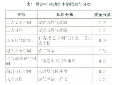 火焰監(jiān)控通常與燃?xì)馇袛喙δ荜P(guān)聯(lián),所以燃燒控制功能屬于C類安全。如果燃燒控制不包括火焰監(jiān)控功能,僅是一些時序與邏輯的控制,其功能安全可根據(jù)失效后果歸為B類,具體可參見表1。