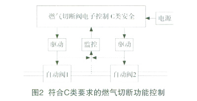 第二,兩個閥門同時由符合C類安全的電子控制器控制,整體可以達(dá)到C安全要求,如圖2。當(dāng)自動閥1失效,如果電子控制器符合C類安全,自動閥2在任意兩個故障的條件下均可以保證處于安全狀態(tài),所以整體符合C類安全要求。按照這種分析,自動閥1、2是可以同時驅(qū)動的(并聯(lián))。所以閥的冗余與閥驅(qū)動的冗余是安全設(shè)計兩個方面,都必須要做到。