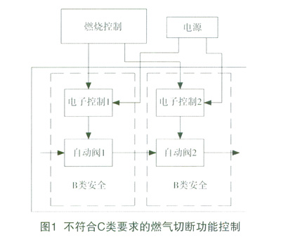 第一,兩個閥門的控制均符合B類安全要求,但組合是不能達(dá)到C安全要求的,如圖1。從閥門組合的容錯上分析,當(dāng)其中一個閥門失控(如有雜物或卡死),另一個閥能保持正常即可符合安全要求。例如,自動閥2失控,自動閥1必須保證安全。B類安全的要求是電子控制1在第一個故障的條件下保證安全狀態(tài),但該故障可能不被檢測到,當(dāng)?shù)诙€故障仍出現(xiàn)在電子控制1時,電子控制1可能導(dǎo)致自動閥1不受控,這樣兩個閥都不受控,所以不符合C類安全要求。