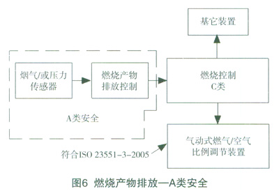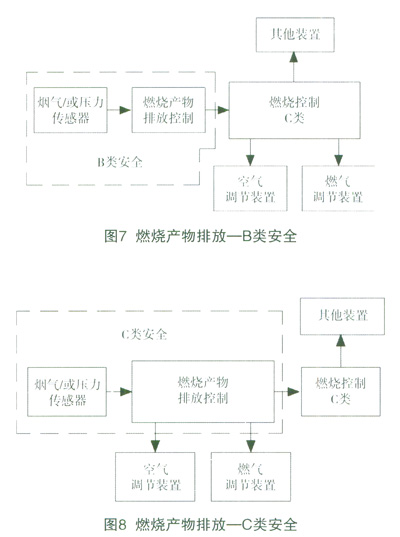 燃燒產物排放控制功能可以分屬于A類、B類或C類安全,這與燃燒結構及燃燒控制等安全相關系統有關。實例如圖6、7、8,從中可以看到分類的區別,總的原則是根據該功能失效產生的后果來評估。