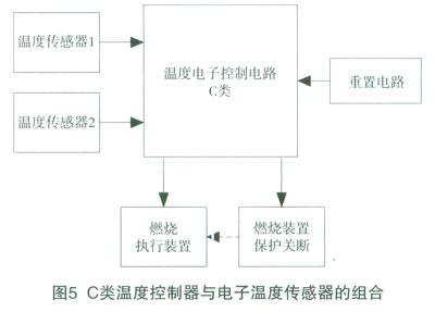 如圖5,這種設計沒有一個最后的獨立保護裝置,安全依賴于系統安全完整性(參考文獻[2])的要求保證。其中一個溫度傳感器設在燃燒器(或熱交換器),另一個在輸出熱水端。當其中一路溫度傳感器或其檢測電路失效,另一路可以被監測并保護。由于采用全電子控制器來實現溫度控制功能,該電子控制器必須按照C類電子控制器的要求來設計,軟件也必須符合C類軟件要求,這樣使整體符合C類安全要求。