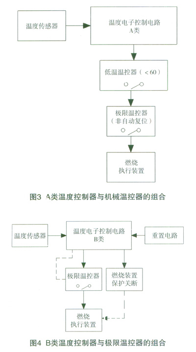 如圖3,這是一個傳統的解決方法,使崩了機械控溫的組合,即由溫度控制(溫度調節器)和防止溫度過熱風險(溫度限定器)構成,具體要求可參見器具標準(例女HEN297、EN483)的內容要求。機械溫控結構是由多年實踐而產生的并依賴冗余技術作為原理,被認為是安全的,不需要控制器另外采取特別的措施。此處A類溫度控制電子電路與低溫溫控器可以相當于一個機械的溫度凋節器。