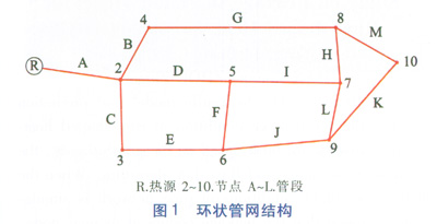 某小型環狀管網由1個熱源,13段管段,10個節點和4個環組成。我們認為泄漏發生在節點處,若不考慮參考節點(算例中選取熱源定壓作為參考節點,定壓水頭為94.65m),那么存在9個可能泄漏的位置(節點2~10),時間步長取1s,泄漏面積取0.001m2。環狀管網結構見圖1。各管段長度、公稱直徑見表1,設計工況下各節點流量見表2。
