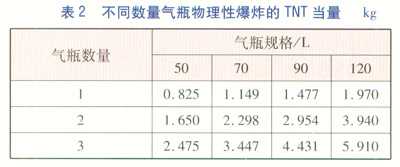 另外,部分CNG汽車(chē)會(huì)將幾個(gè)氣瓶放在一起,且放置距離較近。當(dāng)一個(gè)氣瓶發(fā)生爆炸時(shí),可能會(huì)引發(fā)周?chē)钠渌麣馄勘ǎ瑥亩鴮?dǎo)致爆炸能量成倍增加。表2為不同數(shù)量的4種常用氣瓶在20MPa的情況下破裂后發(fā)生物理性爆炸的TNT當(dāng)量。