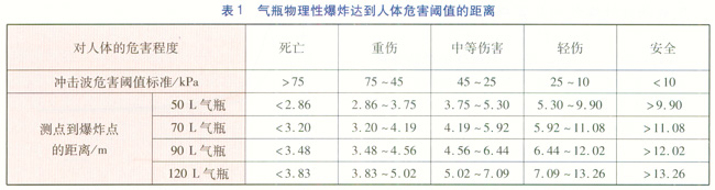 全球領(lǐng)先的專(zhuān)業(yè)風(fēng)險(xiǎn)管理服務(wù)機(jī)構(gòu)挪威船級(jí)社(DNV)在SAFETI軟件的定量風(fēng)險(xiǎn)評(píng)價(jià)中,根據(jù)沖擊波對(duì)人體的損傷程度,按沖擊波超壓峰值的大小,將爆炸產(chǎn)生沖擊波的危害程度分為死亡、重傷、中等傷害、輕傷、安全5個(gè)區(qū)域,并給出了各個(gè)區(qū)域?qū)?yīng)的爆炸沖擊波危害閾值標(biāo)準(zhǔn)[8]。根據(jù)該閾值,本文采用MATLAB編制計(jì)算程序[9],計(jì)算出4種常見(jiàn)規(guī)格的氣瓶在20MPa的情況下破裂發(fā)生物理性爆炸達(dá)到人體危害閾值的距離,見(jiàn)表1。