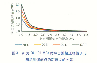 當(dāng)Z≥1時(shí),公式的精確度較高;當(dāng)Z<1時(shí),測(cè)點(diǎn)距爆炸點(diǎn)較近,因受到爆炸產(chǎn)物的影響,使得數(shù)據(jù)有一定的偏差。根據(jù)公式(5)~(7),繪制出當(dāng)爆炸前氣瓶?jī)?chǔ)氣壓力p1為20.101MPa時(shí),氣瓶容積V1分別為50、70、90、120L的4種常用氣瓶,爆炸產(chǎn)生的沖擊波超壓峰值p與測(cè)點(diǎn)到爆炸點(diǎn)的距離d的關(guān)系曲線,見(jiàn)圖3。