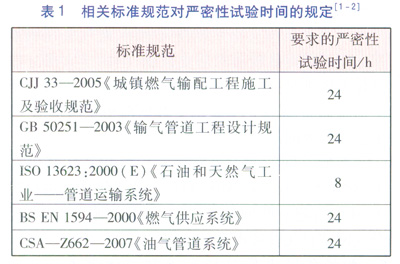 表1列出了相關(guān)標準規(guī)范對嚴密性試驗時間的規(guī)定[1-2]。由表1可以看出,不同標準規(guī)范對嚴密性試驗所規(guī)定的時間差異較大。