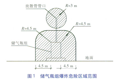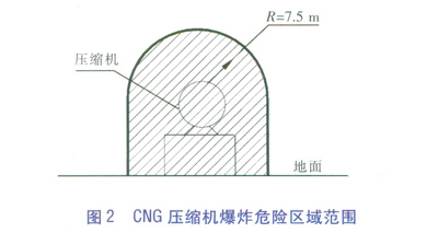 查看規范GB 50156—2012附錄C爆炸危險區域圖,露天設置的CNG儲氣瓶組、CNG壓縮機的爆炸危險區域范圍見圖1、2,圖中陰影部分表示爆炸危險區域(2區)。