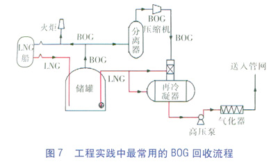 一般在實踐中,將液化工藝與返補(bǔ)真空等BOG處理方式相結(jié)合,取其優(yōu)點,圖7為工程實踐中最常用的80G回收流程[17]。