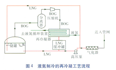 儲罐內(nèi)的BOG經(jīng)過分離器分離后進(jìn)入BOG壓縮機(jī)增壓,增壓后的氣體通過再冷凝器吸收液氮放出的冷量液化為LNG,繼而送回儲罐或外輸。白改玲等[15-16]在此基礎(chǔ)上進(jìn)行了優(yōu)化,使得BOG的回收方法更具實用性。成都深冷公司[17]針對具體的加氣過程,提出了具有BOG回收功能的LNG無泵加氣方法。