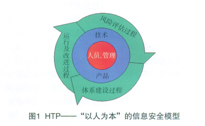 從宏觀的角度來看,信息安全可以由以下HTP模型來描述:人員與管理(Human and management)、技術與產品(Technology and products)、流程與體系(Process and frahiework)。見圖1。