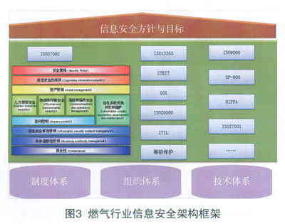 在構建燃氣行業的信息安全架構時應充分利用等級保護、ISO27000、ISO20000、CoBIT等信息化控制標準與最佳實踐,制定出周密的、系統的、適合組織自身需求的信息安全架構。