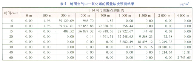 泄漏條件:一氧化碳的泄漏質(zhì)量流量為0.76kg/s,泄漏持續(xù)時(shí)間為10min,泄漏點(diǎn)高度為3m,每10s釋放一個(gè)煙團(tuán)。氣象條件:風(fēng)速為1.8m/s,大氣穩(wěn)定度為D級(jí)。采用多煙團(tuán)模式預(yù)測(cè)方式的預(yù)測(cè)結(jié)果見(jiàn)表4。根據(jù)預(yù)測(cè)結(jié)果,可分析不同時(shí)刻下風(fēng)向地面空氣中一氧化碳質(zhì)量濃度超標(biāo)距離范圍。