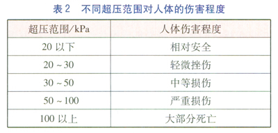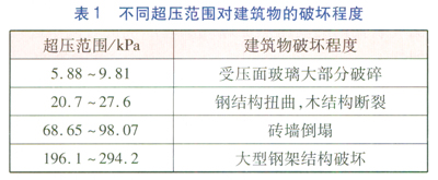 由沖擊波一沖量準(zhǔn)則確定的不同超壓范圍對(duì)建筑物的破壞程度、人體的傷害程度分別見(jiàn)表1、2。