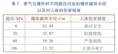 以建筑物破壞程度作為基準(zhǔn),超壓選取不同建筑物破壞程度對(duì)應(yīng)的超壓最小值(并進(jìn)行圓整),由式(1)、(2)計(jì)算壓縮機(jī)房泄漏焦?fàn)t煤氣發(fā)生蒸氣云爆炸時(shí),不同超壓對(duì)應(yīng)的爆炸破壞半徑,并判定對(duì)人體傷害程度,見(jiàn)表3。