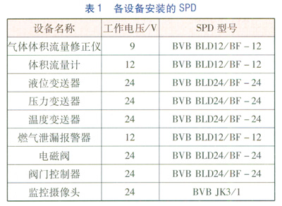①利用SPD將設備各端口的對地電位限制在設備能承受的范圍內(nèi),同時將各端口的感應過電壓、過電流泄放到地,實現(xiàn)對設備的保護。安裝在室外的設備在各進出線端安裝SPD,SPD需安裝于防水防爆屏蔽箱內(nèi)。該措施解決了上述隱患①~⑥。具體各設備安裝的SPD見表1。