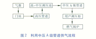 為改造后燃氣供熱鍋爐房(大多數為中小型燃氣鍋爐房)供氣的中壓燃氣管道既有新建、現有中壓A級管道,又有現有中壓B級管道。中心城區現有中壓燃氣管道總長度約1 377 km,其中設計壓力為0.15MPa的中壓B級管道約450km。新建中壓A級管道主要規格為DN 400~800mm,設計壓力為0.4MPa,新建中壓A級管道基本沿市政主干路網敷設。供熱規模較大的中型燃氣供熱鍋爐房均由新建中壓A級管道供氣,供熱規模較小的小型燃氣供熱鍋爐房由現狀中壓A級或中壓B級管道供氣。利用中壓A級管道的供氣流程見圖2。