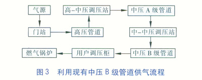 由于市內六區現有中壓B級管道已運行多年,且腐蝕比較嚴重,短期內無法完成更換改造工作。結合市內六區現有中壓B級管道與新建中壓A級管道分布情況,建設20座中—中壓調壓柜,將中壓A級燃氣調壓至中壓B級,滿足燃氣供熱鍋爐房用氣需求。由于中心城區用地緊張,煤改氣工程配套的中—中調壓柜采取地下形式,一般設置在市政綠地內。利用現有中壓B級管道的供氣流程見圖3。