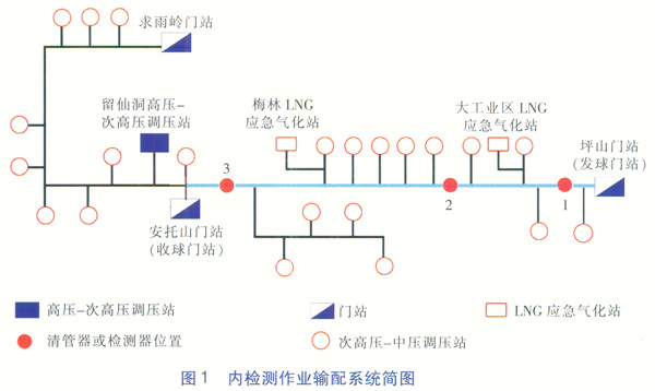 為安全、有序、協調進行作業,建立了項目指揮部,分設管道現場指揮組、廠站現場指揮組、HSE(Health,Safety,Environment)組、應急保障組、調度中心,作業涉及人員185人。管道現場指揮組設置4個跟球小組,滾動式作業,跟球小組需及時向調度中心匯報清管器或檢測器通過設標點的時間。廠站現場指揮組又分為發球組、收球組、工藝操作組。發球組、收球組分別負責在坪山門站發球,在安托山門站收球;工藝操作組則負責在清管器或檢測器通過支線前0.5h和通過后0.5h進行支線上次高壓—中壓調壓站的停止供氣和恢復供氣。
