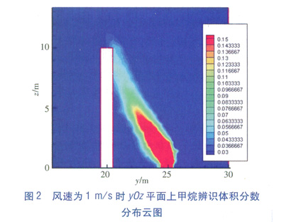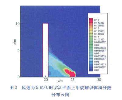 不同風速下yOz平面上甲烷辨識體積分數分布云圖(視線方向為x軸負方向)見圖2~4。由圖2可知,當風速為1m/s時,障礙物迎風面危險體積分數范圍分布在7~10m高度范圍內。當風速為5m/s時,分布在0~5m高度范圍內。當風速為l0m/s時,分布在0~3m高度范圍內。