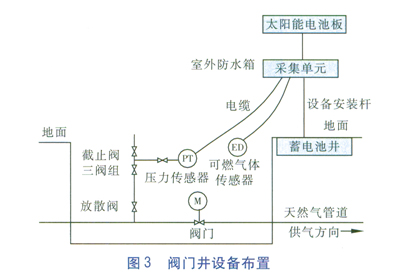天然氣是易燃易爆氣體,野外閥門井又是一個相對密閉的空間環境,因此,一旦發生天然氣泄漏并達到爆炸極限,遇點火源就會引發爆燃事故。為此,該系統采用了防爆設計,閥門井內安裝的壓力傳感器及可燃氣體傳感器均采用本質安全型儀表,而非防爆的采集單元則部署在距離閥門井超過4.5m的設備安裝桿上,并使用安全柵與井內壓力和可燃氣體傳感器進行電氣隔離,從根本上滿足了防爆要求[5],詳見圖3。