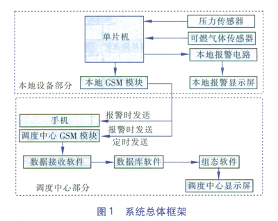 該系統主要由l2部分組成,包括手機、本地GSM模塊、調度中心GSM模塊、單片機、壓力傳感器、可燃氣體傳感器、本地報警電路、本地報警顯示屏、調度中心的數據接收軟件、數據庫軟件、組態軟件、顯示屏。系統總體框架見圖l。