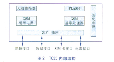 在野外閥門井監測點和調度中心,數據的接收和發送采用GSM模塊TC35,它具有語音呼叫、數據呼叫、短消息等多種功能,本系統主要采用GSM模塊TC35的短消息接收和發送功能,模塊內部結構見圖2。