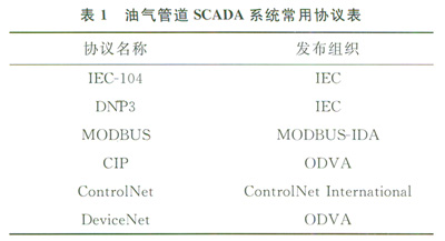 SCADA數據傳輸使用的通信協議,應能保證數據在限定時間內正確送達。根據美國燃氣協會(AGA)發布的AGA-12:1標準[6],SCADA系統中使用的協議有近200個,大都是由不同廠商研發提供的私有協議。經過多年的發展,一些開放的標準協議在工業界得到廣泛應用。表1中列舉了油氣管道SCADA系統中最常用的幾種標準協議。