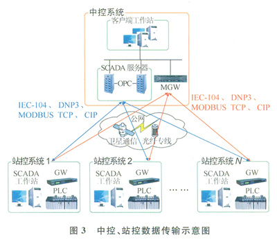 另一種方式是,中控系統通過MGW使用IEC-104、DNP3、MODBUS TCP、CIP等協議實現對所有站控系統的數據采集和控制指令下發。