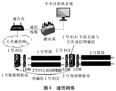 通信網絡完成現場測量站與中央計算機系統之間的雙向數據傳輸。通信網絡的數據傳輸包括從現場測量站到中央計算機系統,從中央計算機系統到現場測量站,從現場測量站到現場測量站(利用傳感器導線實現現場測量站間的通信)。通信網絡見圖4。