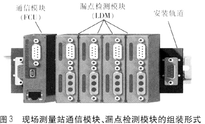 ????現場測量站通信模塊、漏點檢測模塊的組裝形式見圖3,所有模塊均安裝在軌道底板上,結構簡單,安裝方便。漏點檢測模塊的作用是:測量管道與傳感器導線之間的阻抗;通過傳感器導線與其他漏點檢測模塊通信(采用管段兩端測量時);支持不同管段通信模塊間的數據傳輸;當有泄漏發生時,發出報警信號。